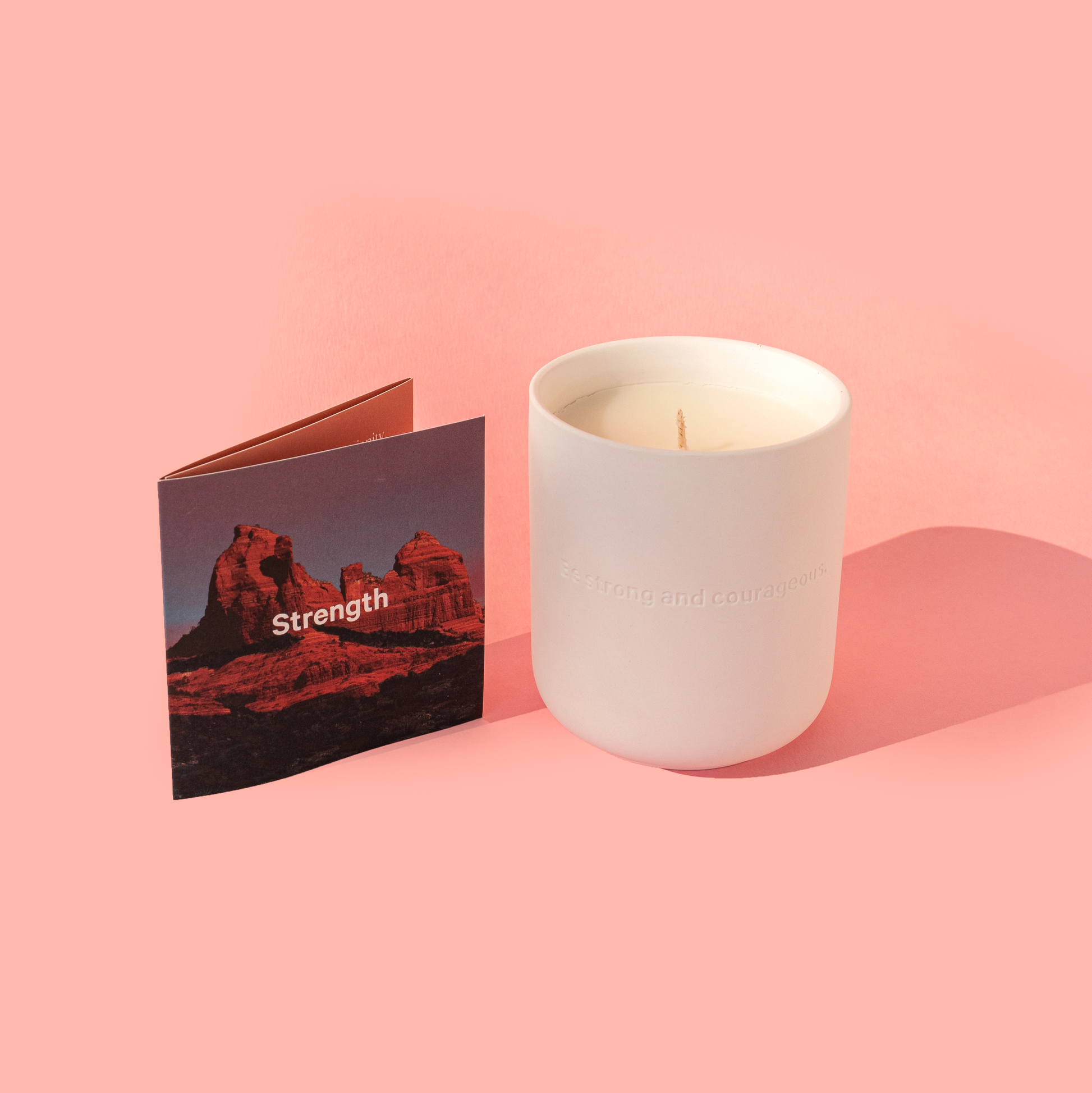 Includes a thoughtfully curated pamphlet-insert, offering reflections on the theme of strength. Inscribed on the ceramic vessel: "Be strong and courageous."